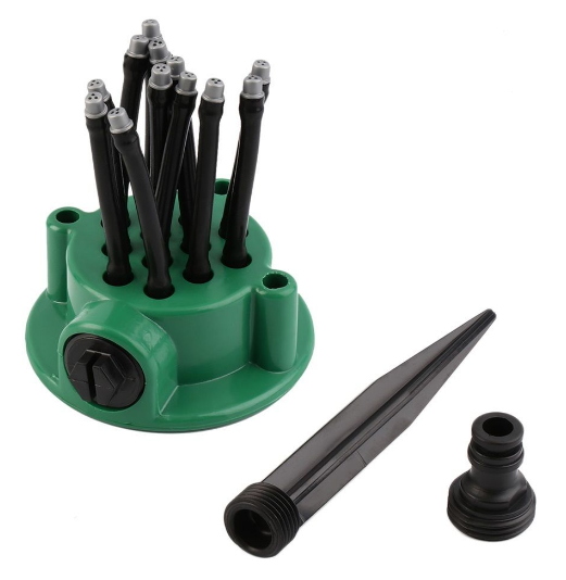 A 360°-ban forgatható fejű öntözőrendszernek köszönhetően nem kell többé a slaggal rohangálni a kertben, sem méregdrága locsolófejeket venni. A szórófejen 12 különálló flexibilis kis cső van, amiken át spriccel a víz, ezeket tetszés szerint állíthatod be, így garantáltan mindenhová el fog jutni a víz. Egy műanyag karó segítségével leszúrható a fűbe, majd nincs más dolgod, mint rákötni a slag gyors csatlakozóját, és megnyitni a vizet.