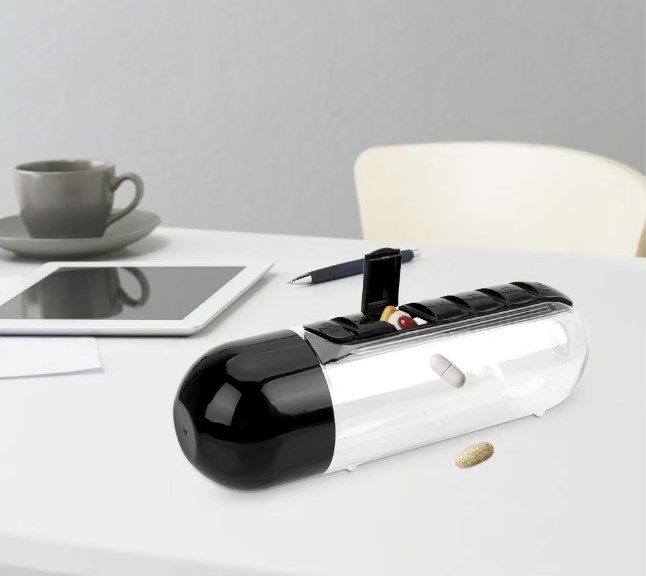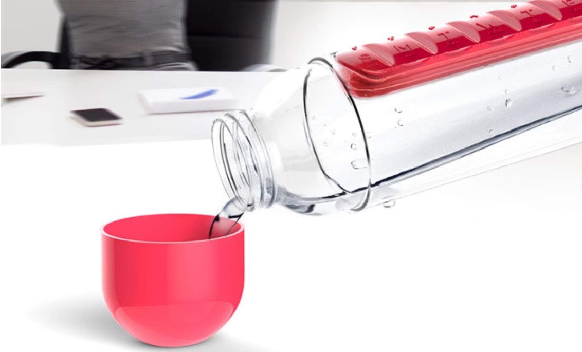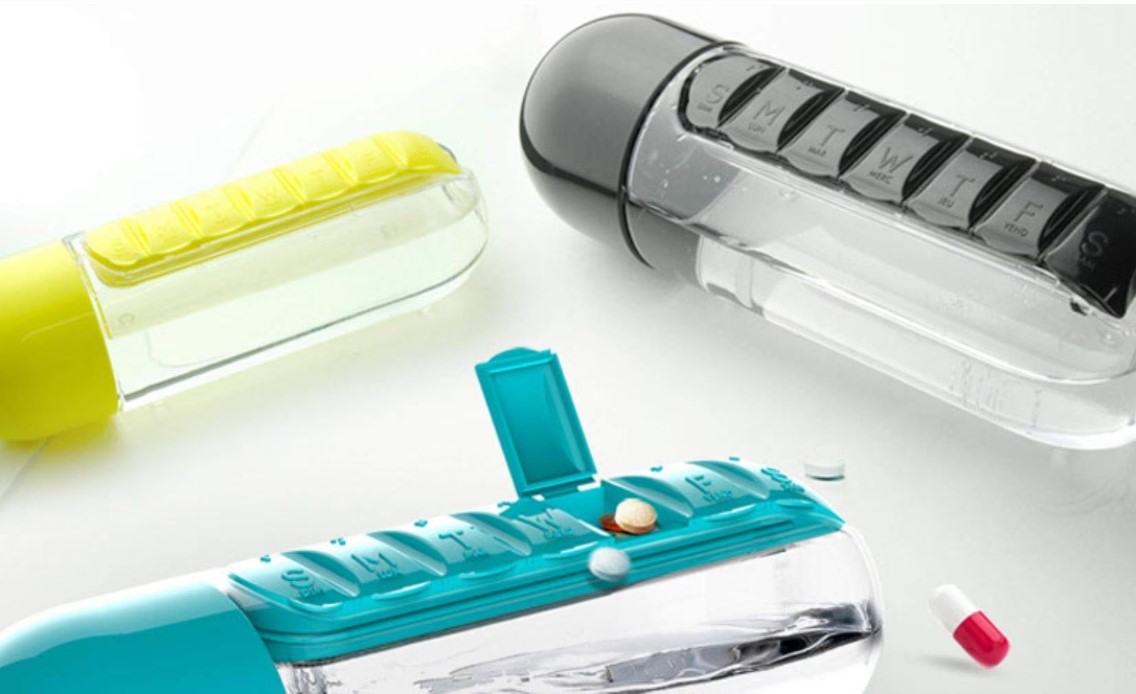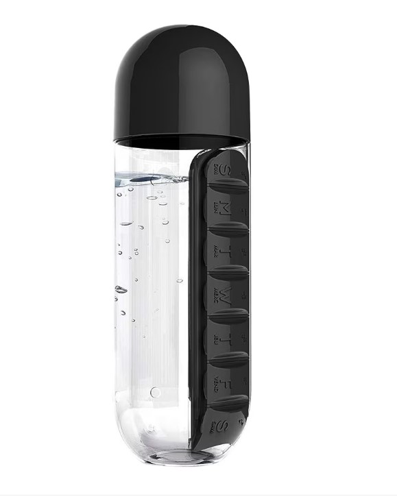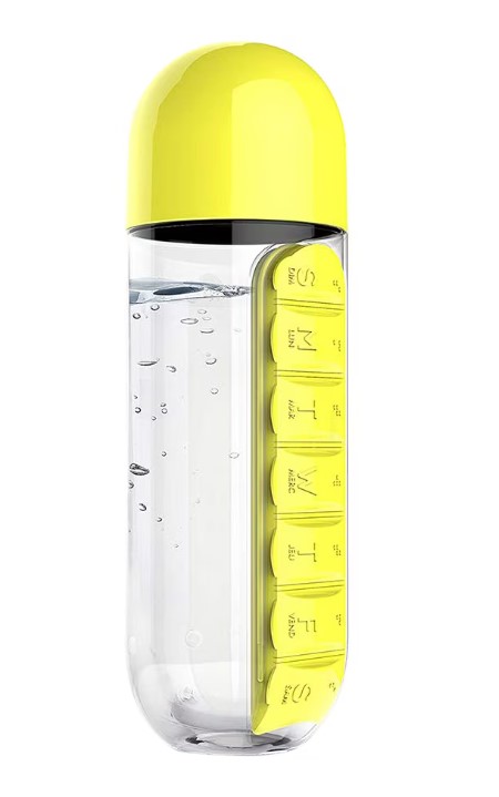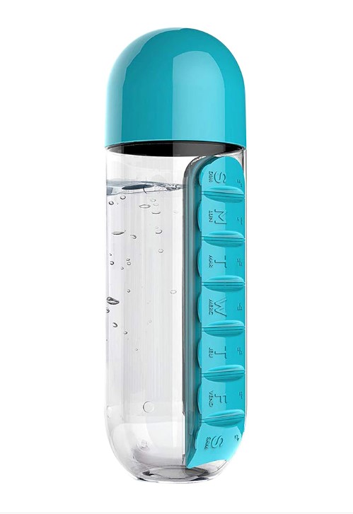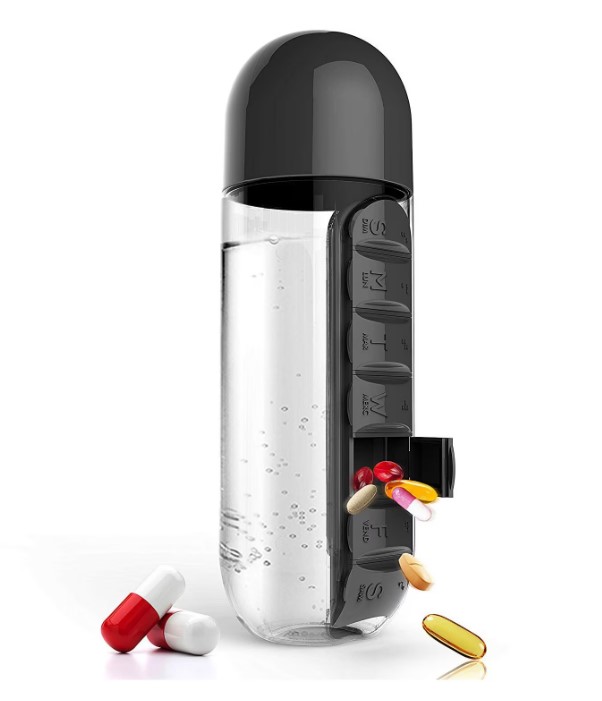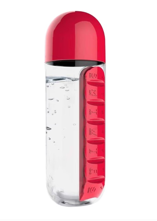 A 600 ml-es kulacs beépített tabletta-rendezővel készült, így a tabletták, a víz is mindig kéznél van.