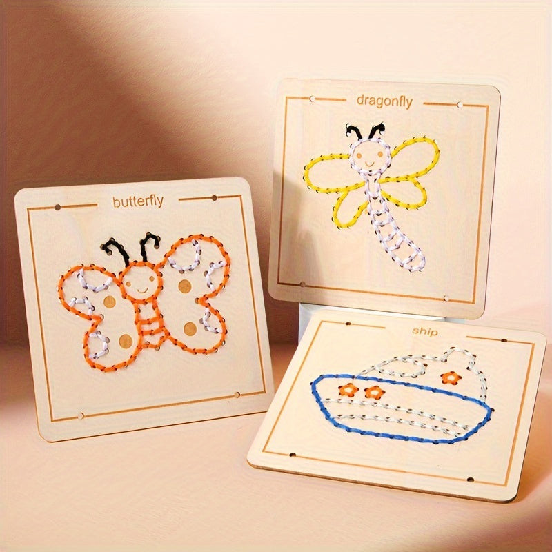 A játék során a gyerekek különféle szálakat fűzhetnek át a táblán lévő lyukakon, így saját egyedi műalkotásokat hozhatnak létre.
