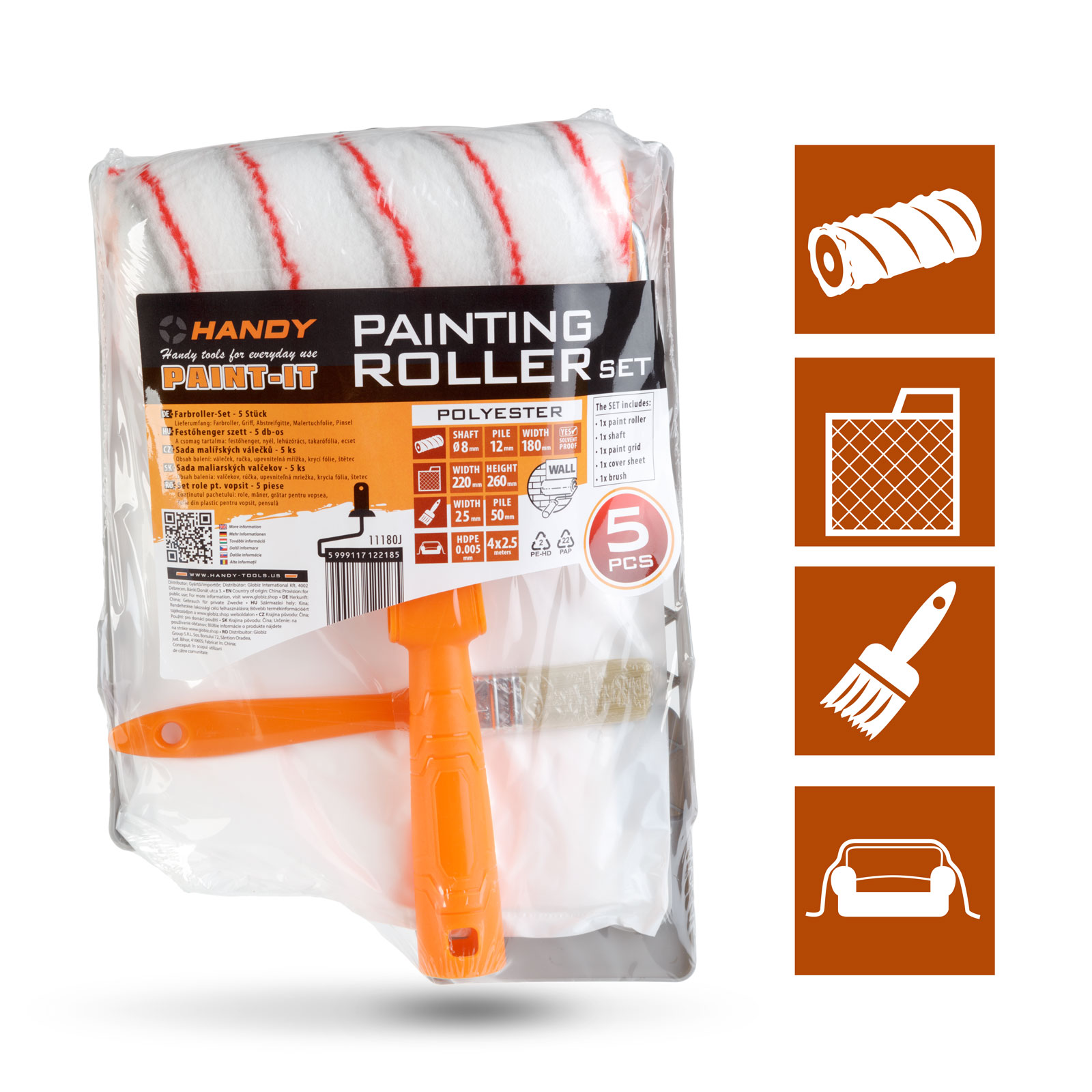 | Szett tartalma: | Festőhenger: 18 cm széles, poliészter, 12 mm szálhossz Festőhenger keret: D5.8 mm acél, cink bevonattal, műanyag nyéllel Ecset: 25 mm széles, 100% PET, műanyag nyéllel Takarófólia: 4 x 2.5 m, 5 mikron, HDPE Festéklehúzó keret: 26 x 22 cm, műanyag |