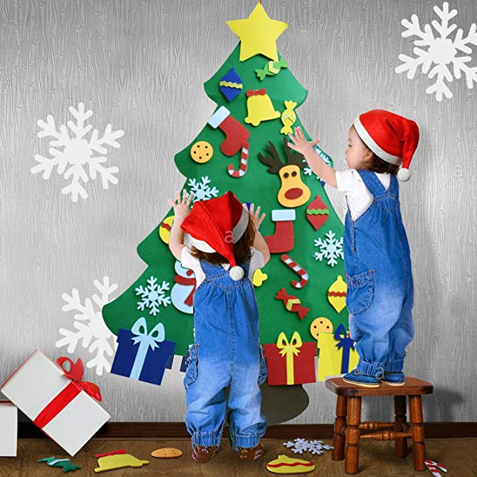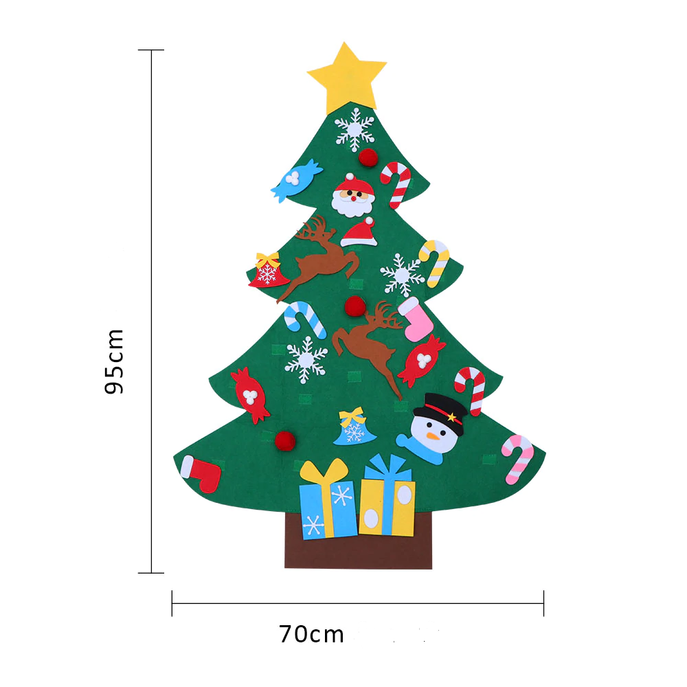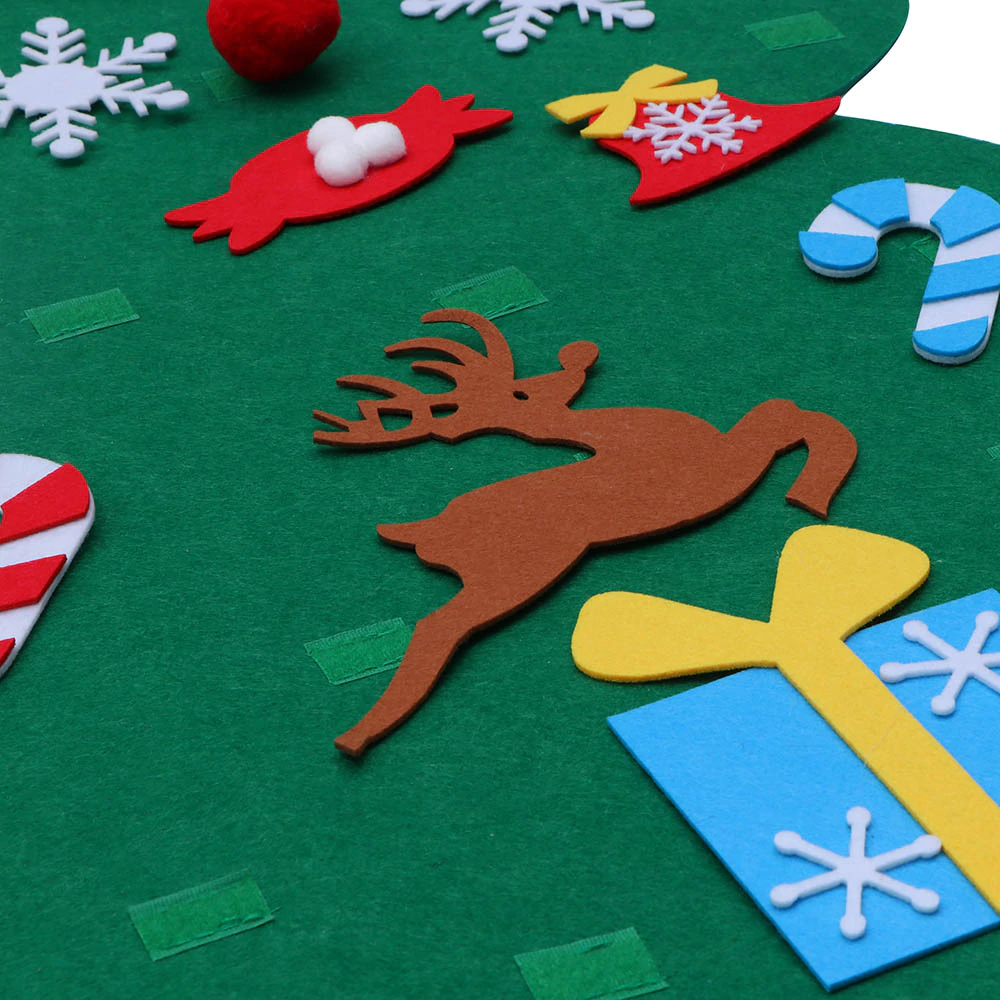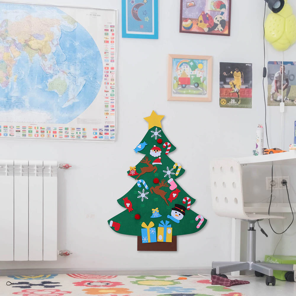 Nincsenek szúrós tűlevelek, törékeny szilánkos díszek. Gyermekbarát filc anyagból készült, hogy a kicsik is ki vehessék részüket a karácsonyfa díszítésből. A díszeket tépőzárral tudjátok rögzíteni. A karácsonyfát a ház bármelyik pontján rögzíthetitek, ehhez kétoldalú ragasztót ajánlunk.