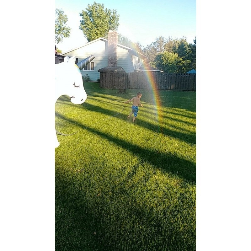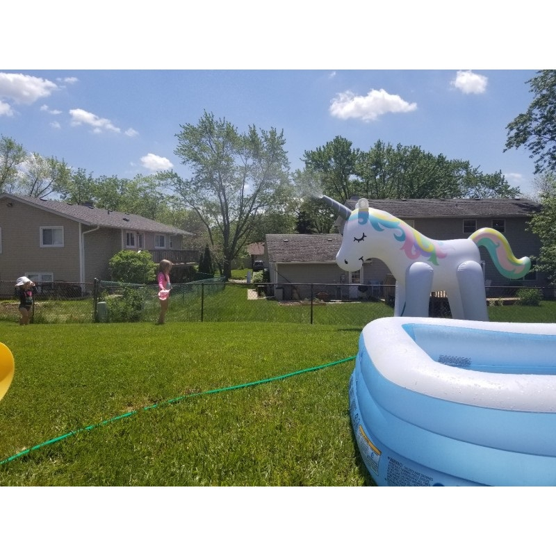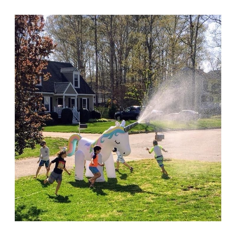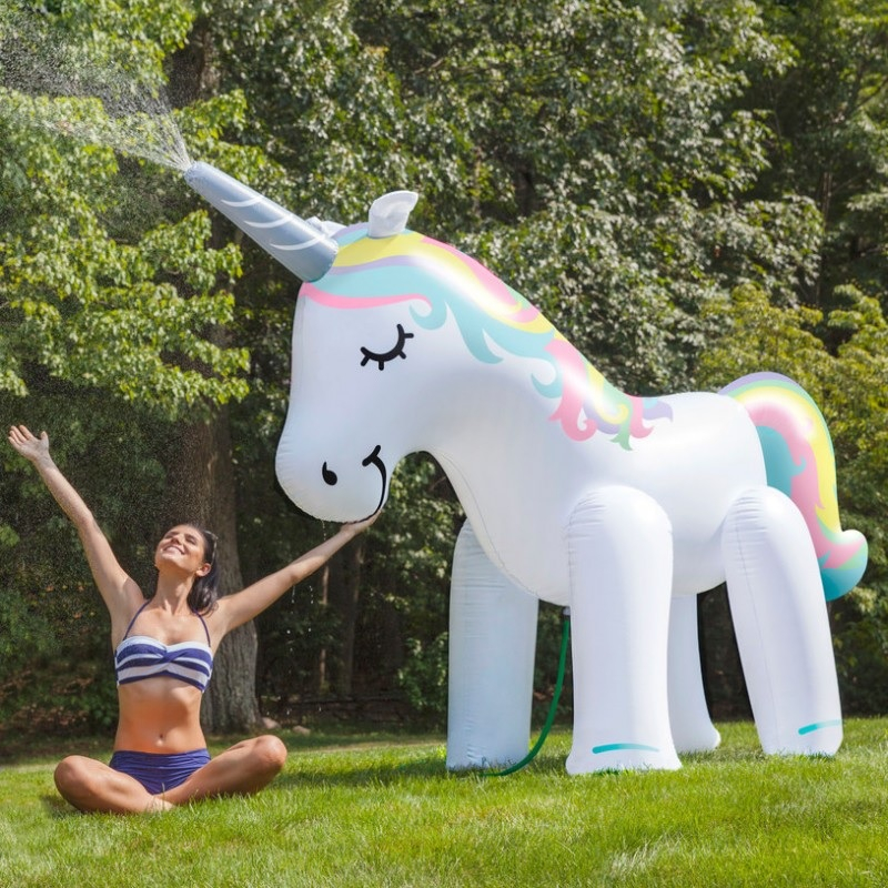 Ezzel a hatalmas unikornissal meglepheti gyermekét, vagy gyermekeit bulikon, nincs más dolga, csak felfújni, és rácsatlakoztatni egy szabványos slag gyorscsatlakozóját, és már permetezi is a vizet az egyszarvú. Tényleg óriási, körülbelül 193cm magas, és 216cm hosszú, azonban leengedve könnyedén tárolható a szezonon kívül is.