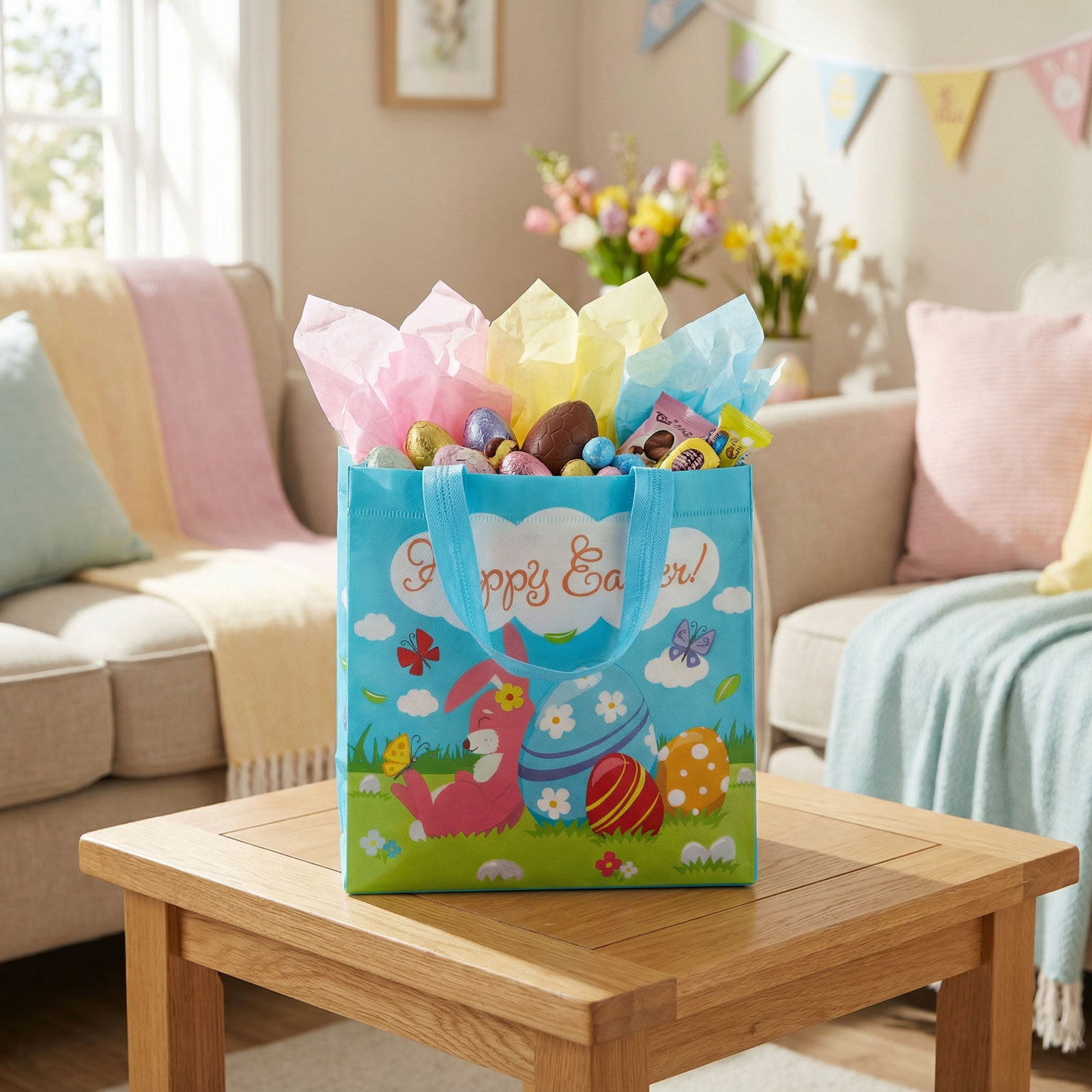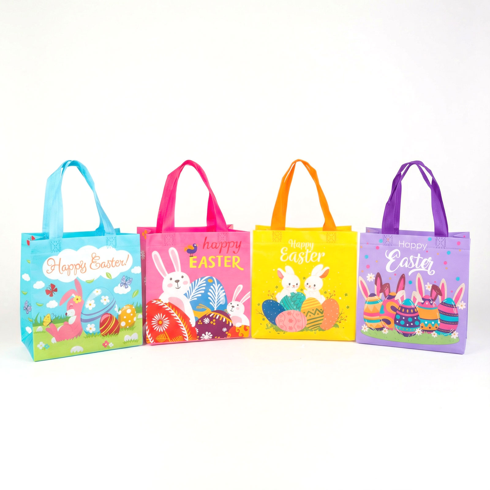 Tegye még különlegesebbé a húsvéti ajándékozást ezekkel a színes, vidám mintás ajándéktáskákkal! A táskák négyféle színben (lila, rózsaszín, narancssárga és kék) kaphatók, mindegyiken aranyos nyuszis és tojásos minta díszeleg. Ideális választás kisebb ajándékok, édességek, meglepetések vagy húsvéti tojások csomagolásához. Strapabíró, mégis könnyű anyagból készült, így praktikus és újrahasználható alternatíva a hagyományos csomagolópapír helyett.