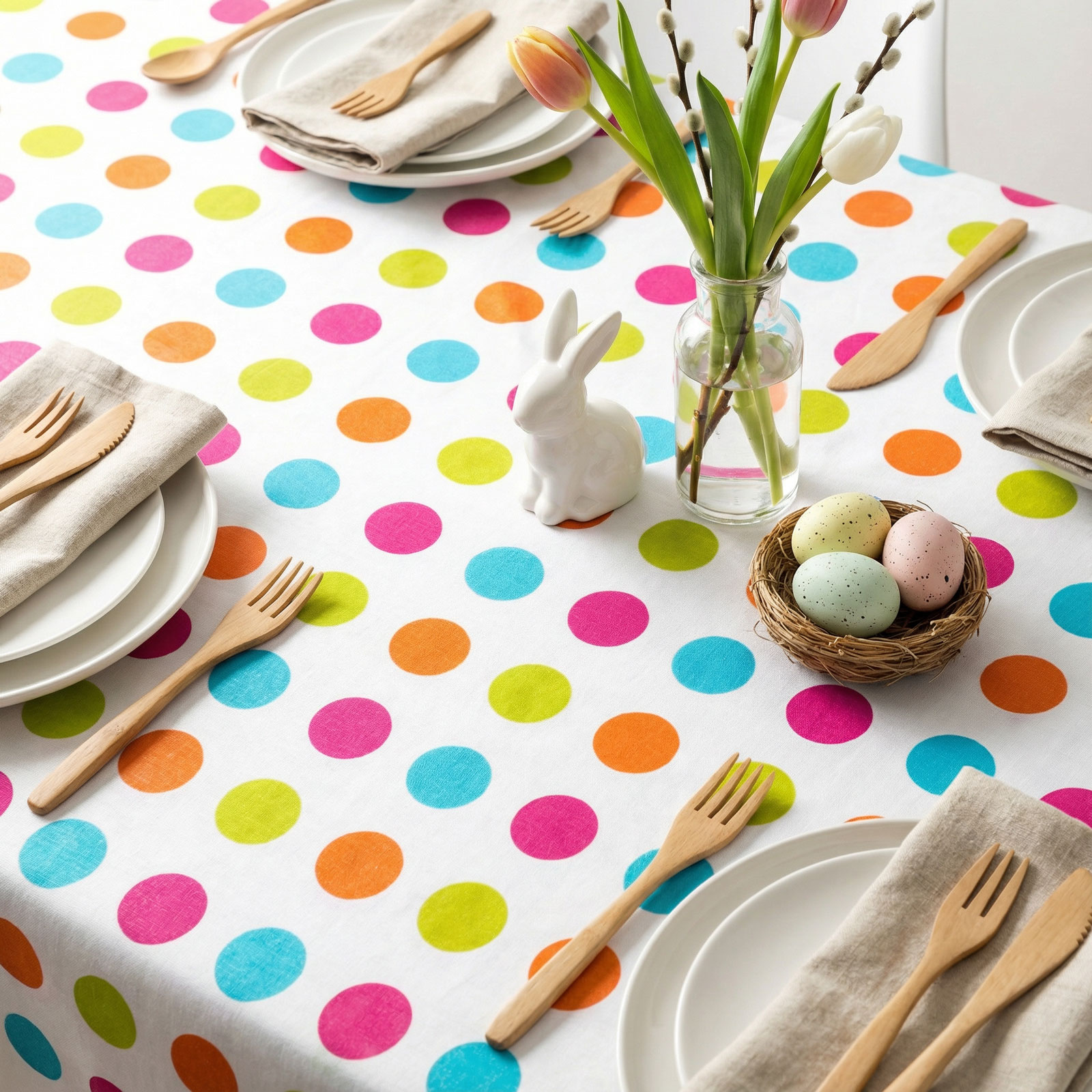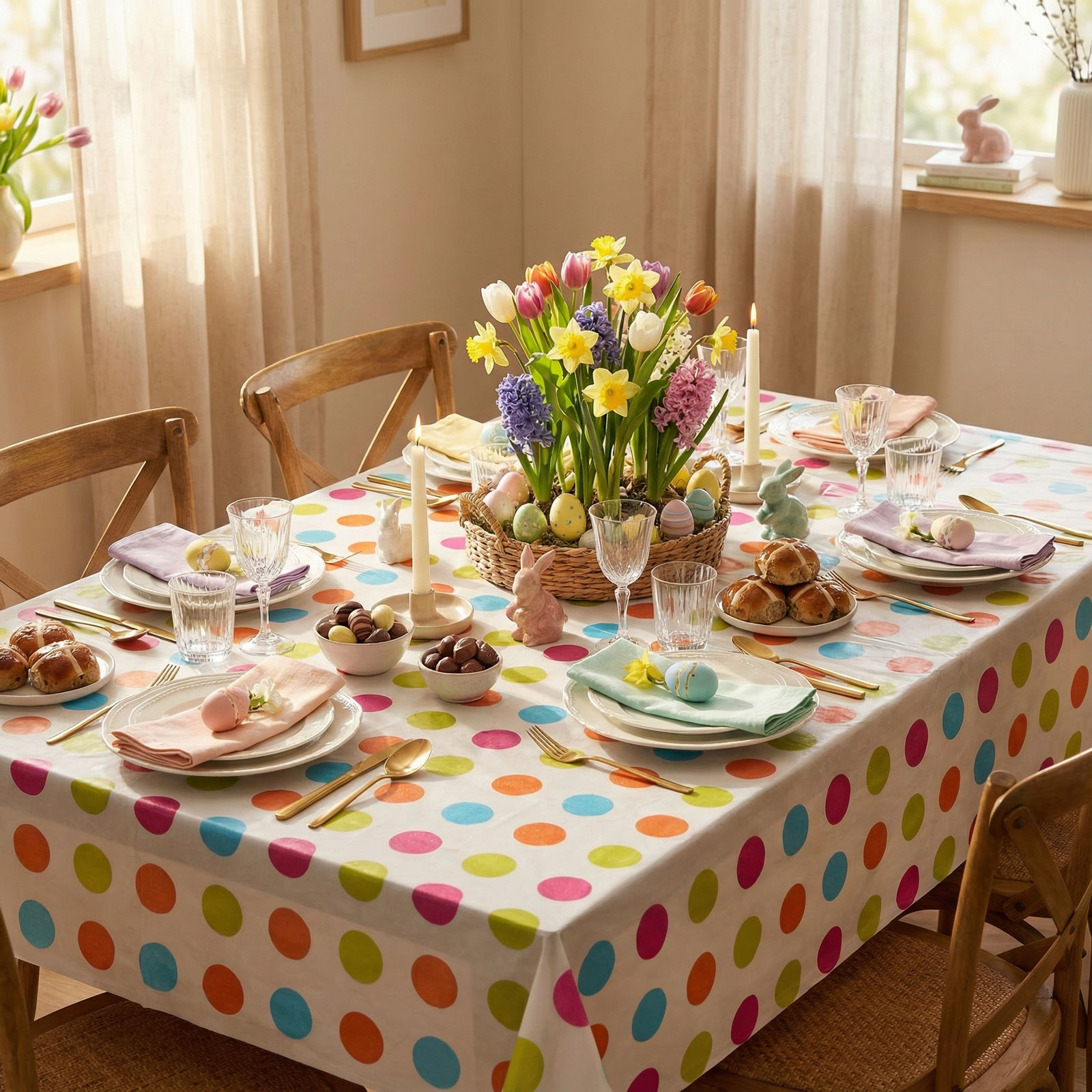 Dobja fel ünnepi asztalát ezzel a praktikus és dekoratív húsvéti asztalterítővel! A flanel hátoldalú terítő ideális választás a húsvéti összejövetelekhez, ünnepi ebédekhez és vacsorákhoz. Vidám, színes mintázata azonnal ünnepi hangulatot varázsol, miközben a flanel anyag védi az asztalt a szennyeződésektől.