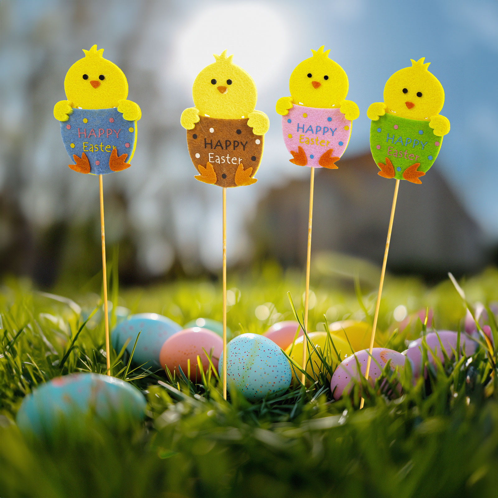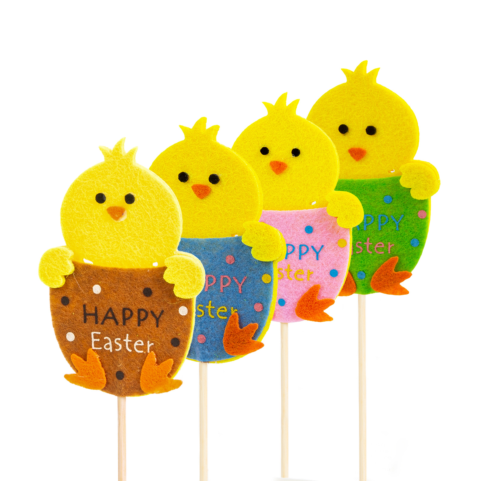 Szobai növények virágcserepébe vagy akár kiskertekbe, virágoskertekbe is leszúrható vidám húsvéti csibék. A hurkapálcián elhelyezett csibék fából készültek. Ideális lehet a húsvét közeledtével bármilyen lakás, kiskert dekorálására.