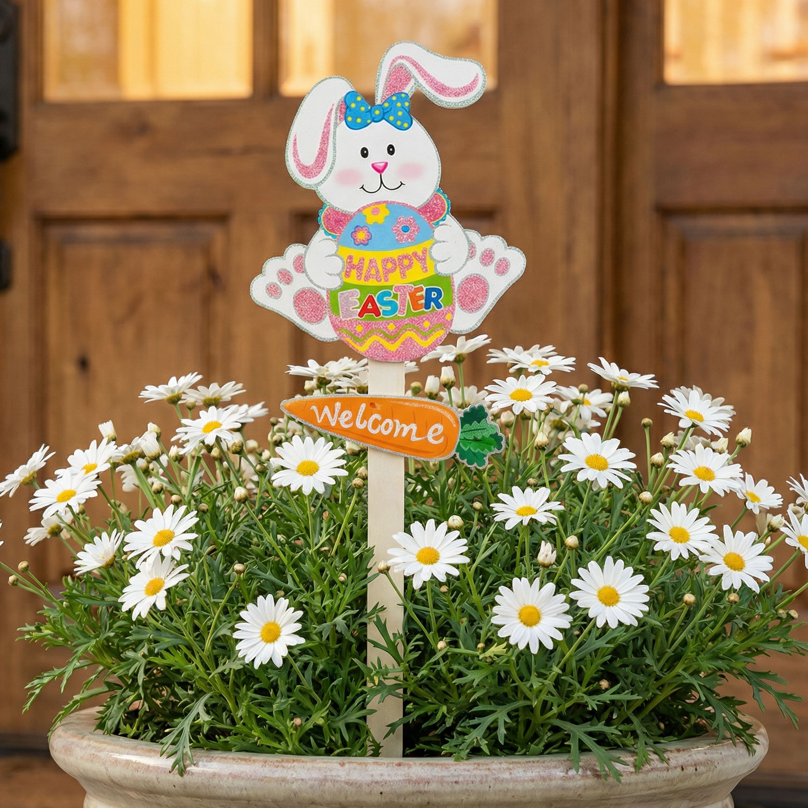 Dobja fel kertjét vagy otthonát ezzel a vidám húsvéti dekorációval! A csillámos hablemezből készült nyuszi színes tojást tart a kezében, „Happy Easter” felirattal. Könnyedén leszúrható a földbe, így kiválóan alkalmas virágágyások, cserepek vagy kerti utak díszítésére. A ragyogó színek és a kedves nyuszi figura garantáltan ünnepi hangulatot teremt.