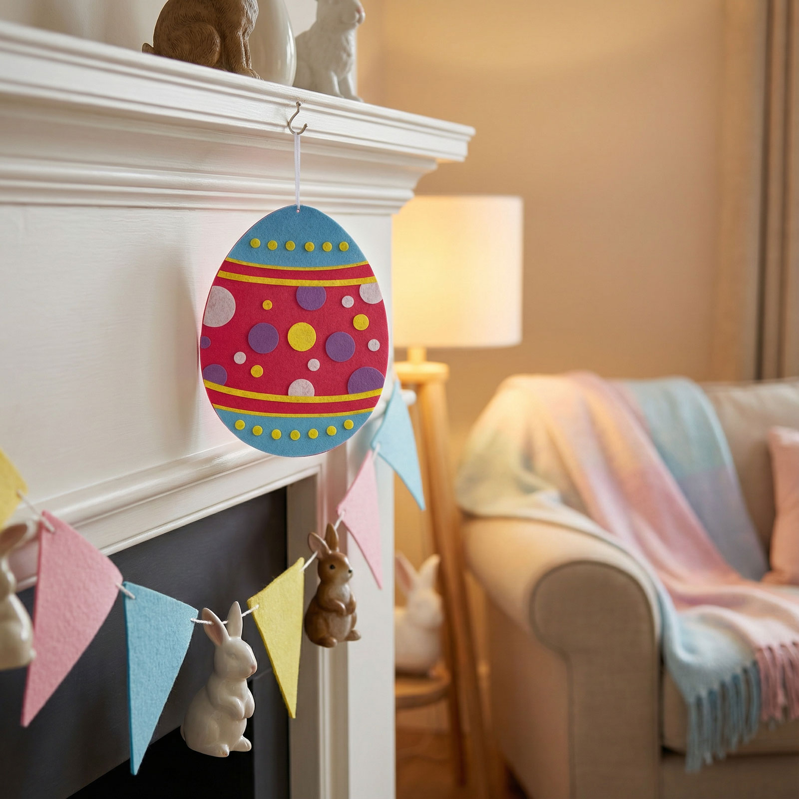 Dobja fel otthonát vagy rendezvényét ezzel a színes, tojás alakú filc függődísszel! A dekoráció vidám, 3D hatású mintákkal és élénk színekkel díszített, amelyek azonnal tavaszi, ünnepi hangulatot teremtenek. Praktikus akasztóval van szerelve, így könnyedén felhelyezhetők ajtóra, falra, ablakra.