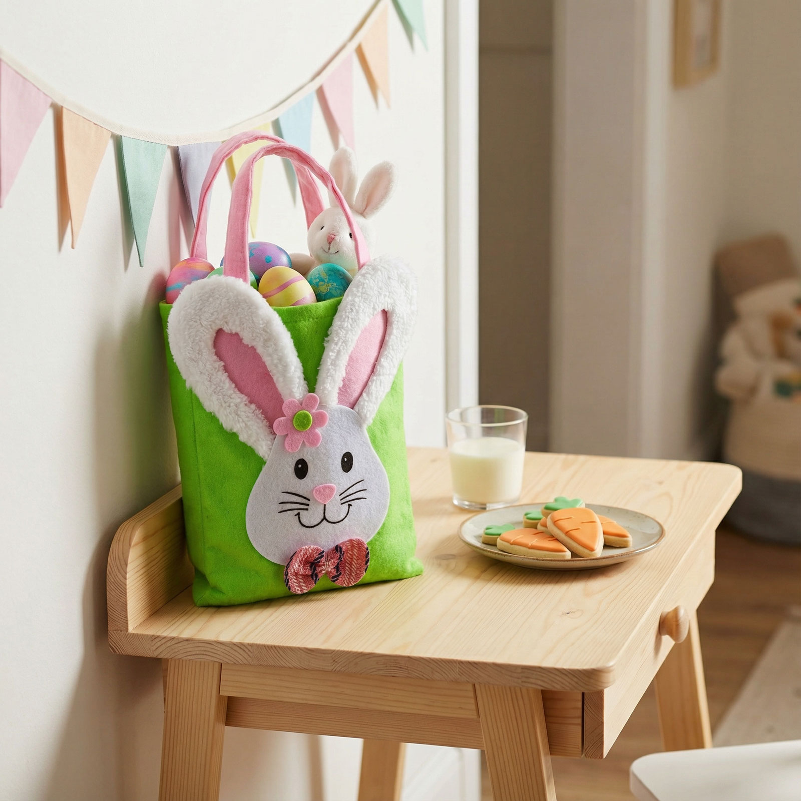 Varázsoljon vidám hangulatot a húsvéti készülődésbe ezzel a bájos nyuszis filc táskával! A táska puha filcből és poliészterből készült, amelyet aranyos nyuszi minta és bolyhos fülek díszítenek. Kétféle színben elérhető: zöld és rózsaszín változatban. Ideális választás gyerekek számára húsvéti ajándék, csoki vagy tojás gyűjtésére, de ünnepi dekorációként is remekül használható. Strapabíró kialakításának köszönhetően hosszabb ideig megőrzi formáját.