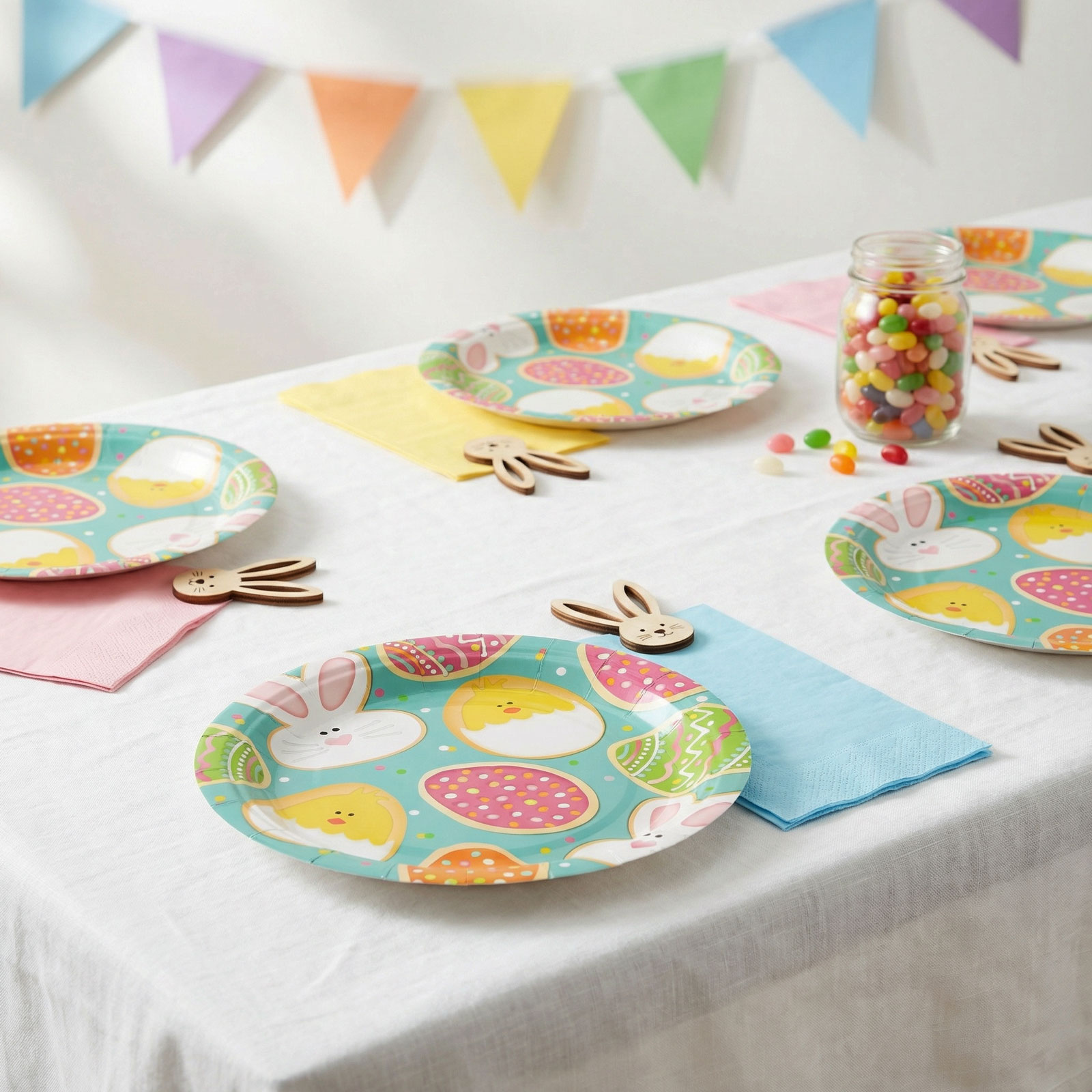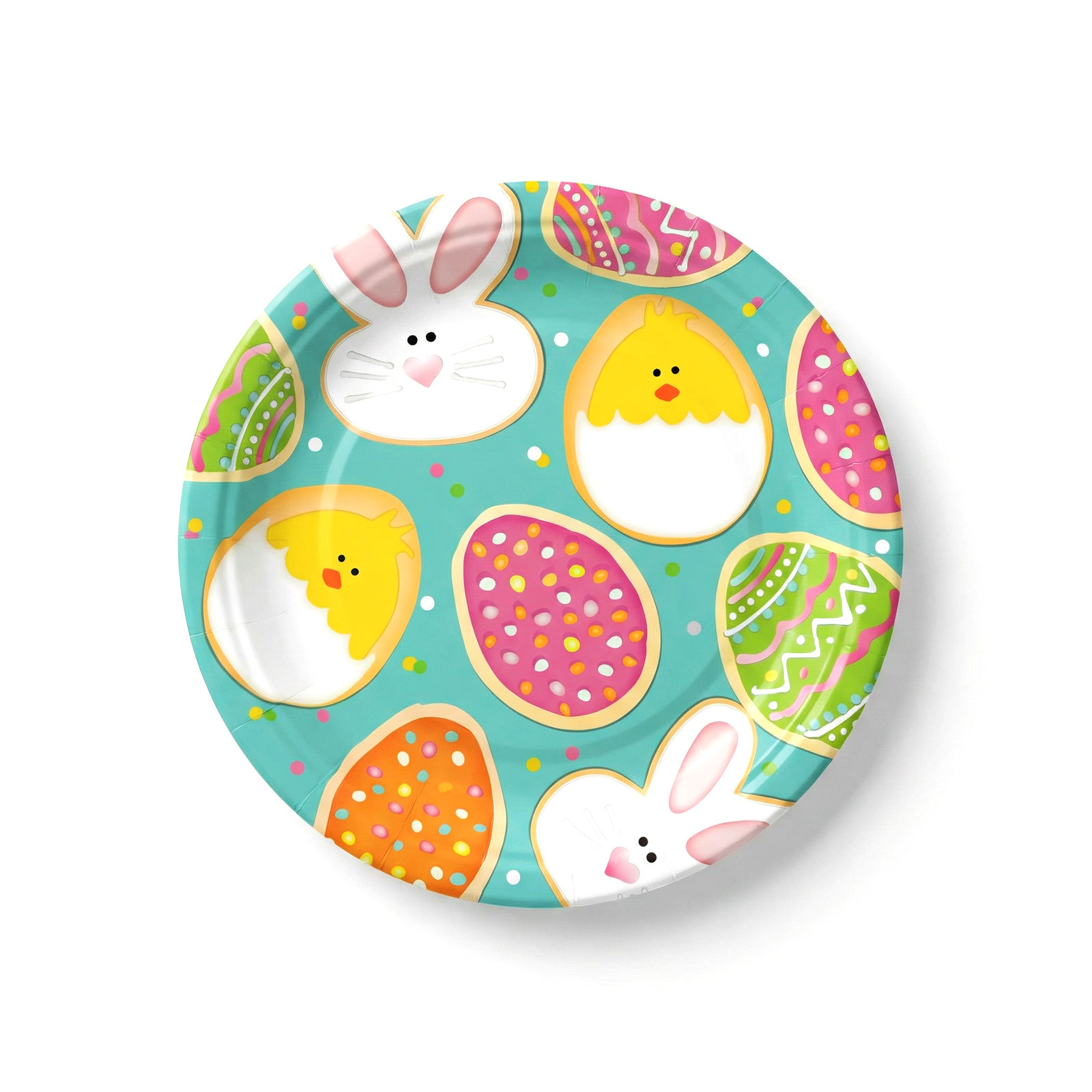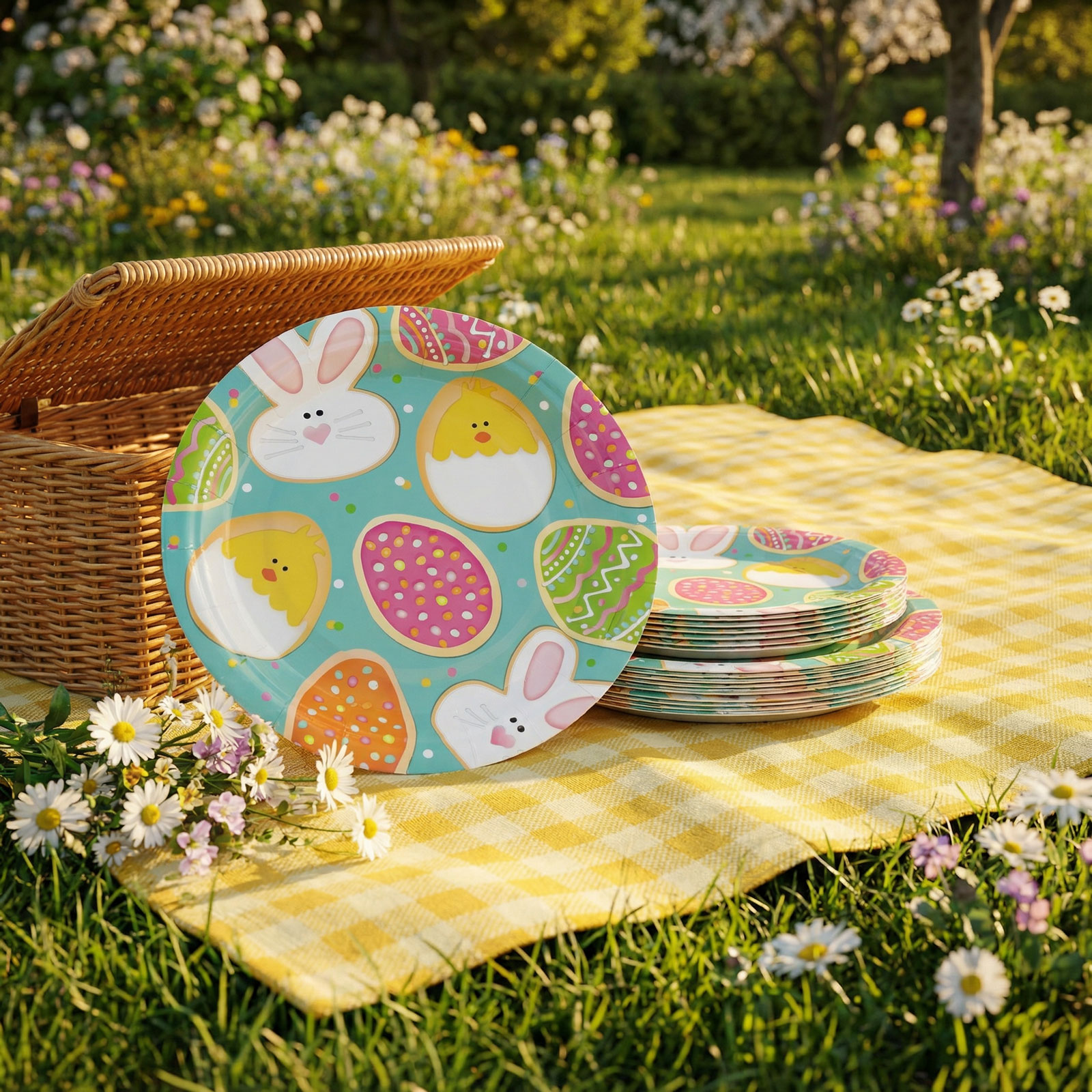 Dobja fel az ünnepi asztalt ezzel a vidám húsvéti papírtányérral! A színes tojásokkal, nyuszikkal és csibékkel díszített mintás tányér igazán hangulatos kiegészítője lesz a húsvéti ebédnek, vacsorának vagy bármilyen ünnepi összejövetelnek. Méretének köszönhetően ideális főételek és desszertek tálalásához is. A csomag 8 darabot tartalmaz, így praktikus és dekoratív választás családi vagy baráti ünnepléshez.
