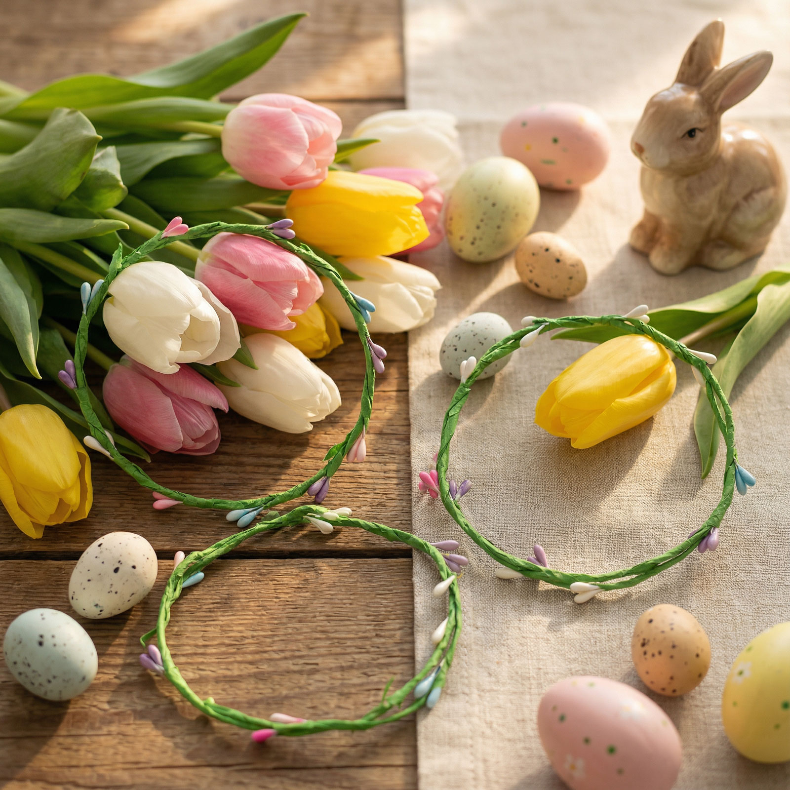 Dobja fel otthonát ezzel a vidám, színes húsvéti koszorúval! A dekoratív koszorú apró, pasztellszínű bimbókkal díszített, amelyek friss és tavaszi hangulatot kölcsönöznek bármely helyiségnek. Ideális ajtóra, ablakra, falra akasztva vagy asztali dekorációként is. Tartós anyagból készült, így évről-évre újra felhasználható. A csomagban 4 darab koszorú található, így több helyiséget, kompozíciót vagy ajándékot is feldíszíthet vele.