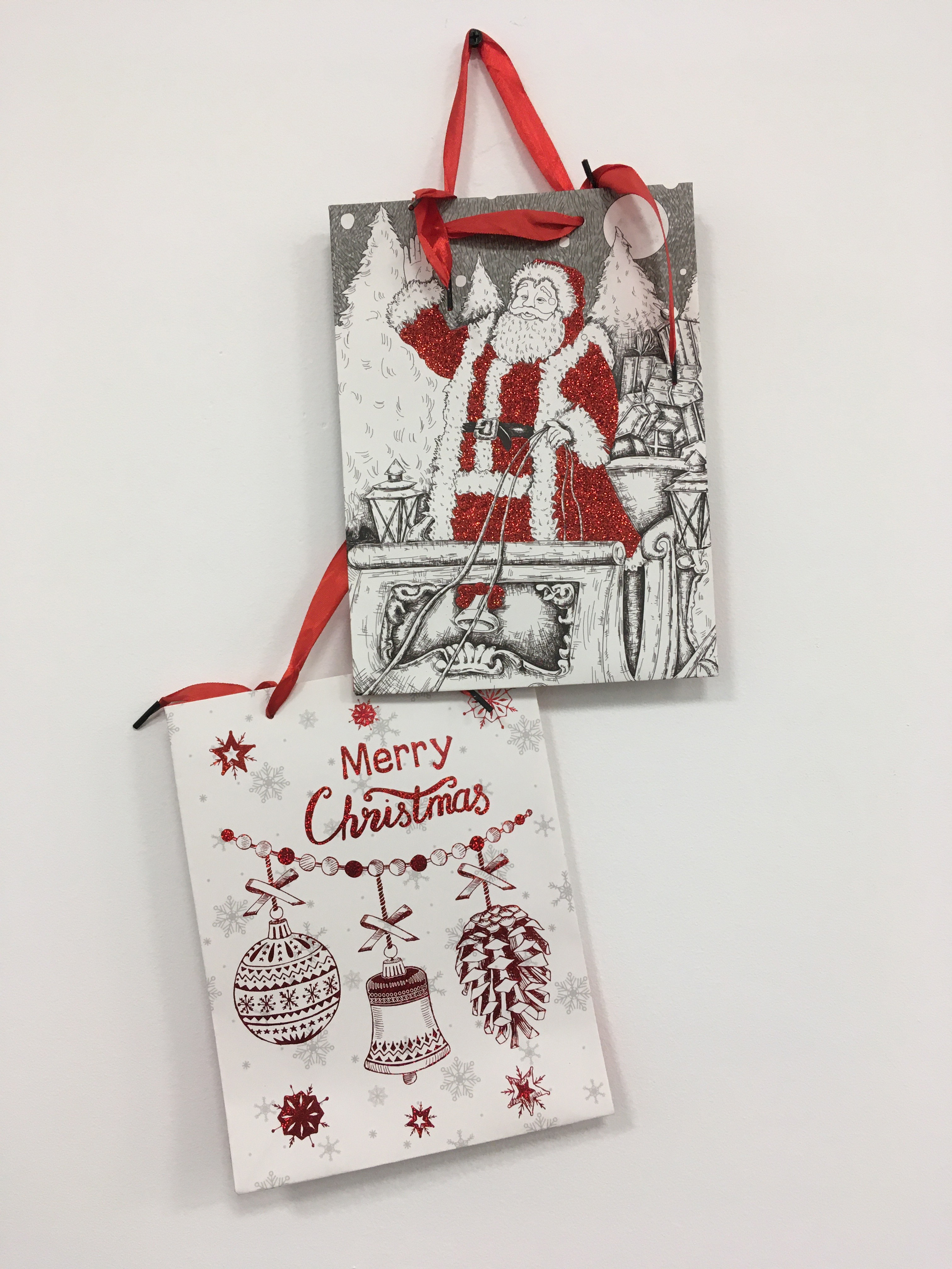 Kis karácsonyi papírtáska, 4 féle karácsonyi/télapós mintával és selyemszalag fülekkel.