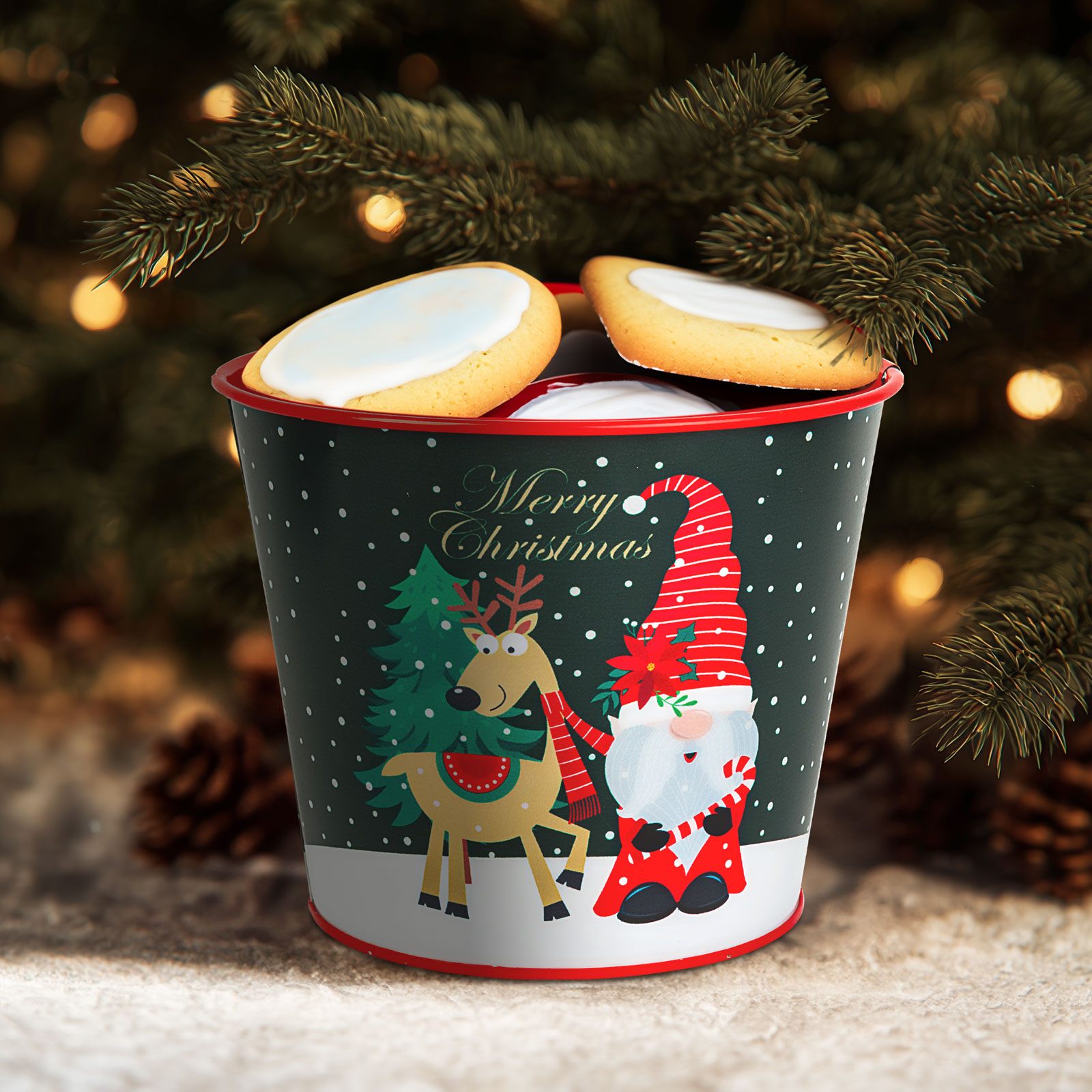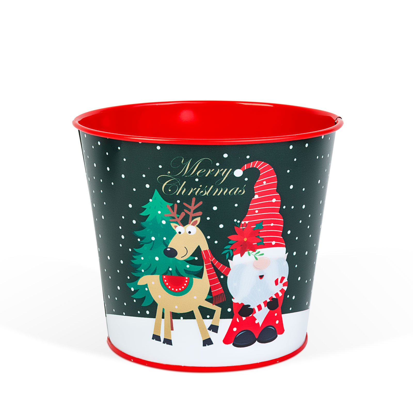 Ez a piros színű, manóval díszített karácsonyi fém kaspó vidám és hangulatos kiegészítője lehet az ünnepi dekorációnak. A hóeséses háttér, a mosolygós rénszarvas motívum ünnepi hangulatot teremt bármely helyiségbe. Használható virágkaspóként, ajándékcsomagolásként vagy apró díszek, édességek tárolására is. Tartós fém anyagból készült, így éveken át újrahasznosítható a karácsonyi dekoráció részeként.