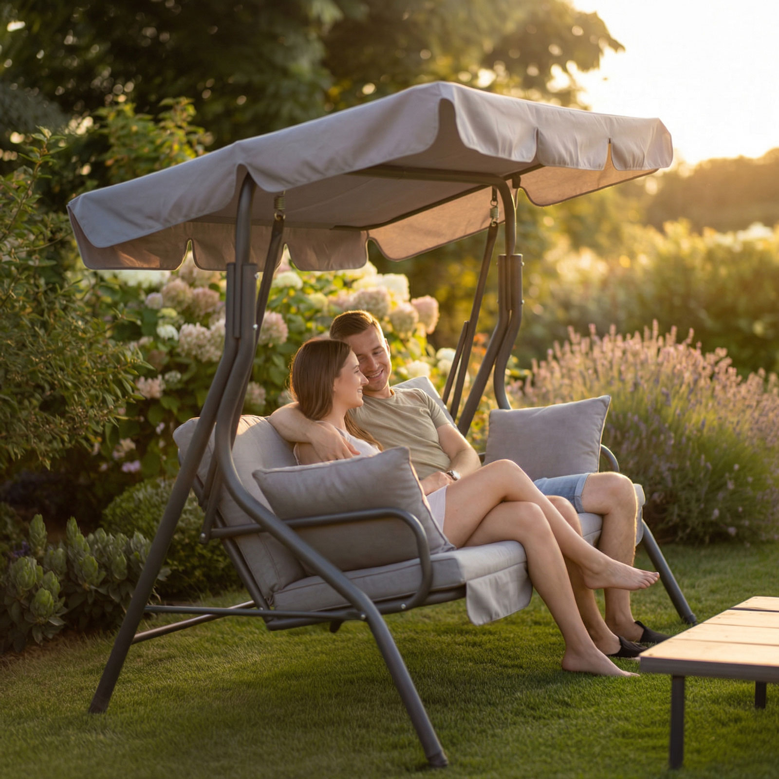 Stabil szerkezetű, stílusos megjelenésű kerti hintaágy akár 3 fő pihenését is garantálja! Ideális választás kertekbe, teraszokra, vagy akár strandokra is! Modern kialakításával és stabil fémszerkezetével garantáltan kiemelkedik majd a kerti bútorok közül. Az időjárásálló kivitelnek köszönhetően a hinta ellenáll az időjárás viszontagságainak, biztosítva hosszú élettartamát.