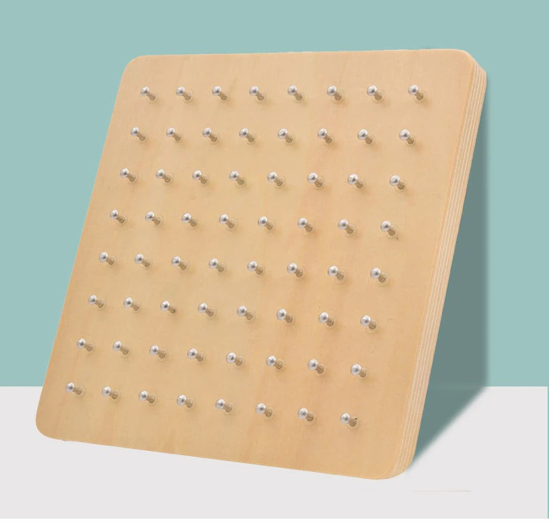 A fa táblán található szegecsek és a csomagban található gumik segítségével különböző formákat alkothat gyermeked.
