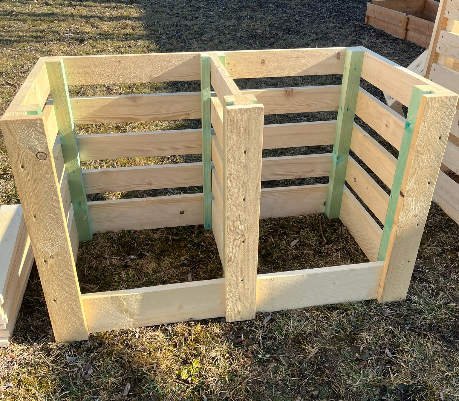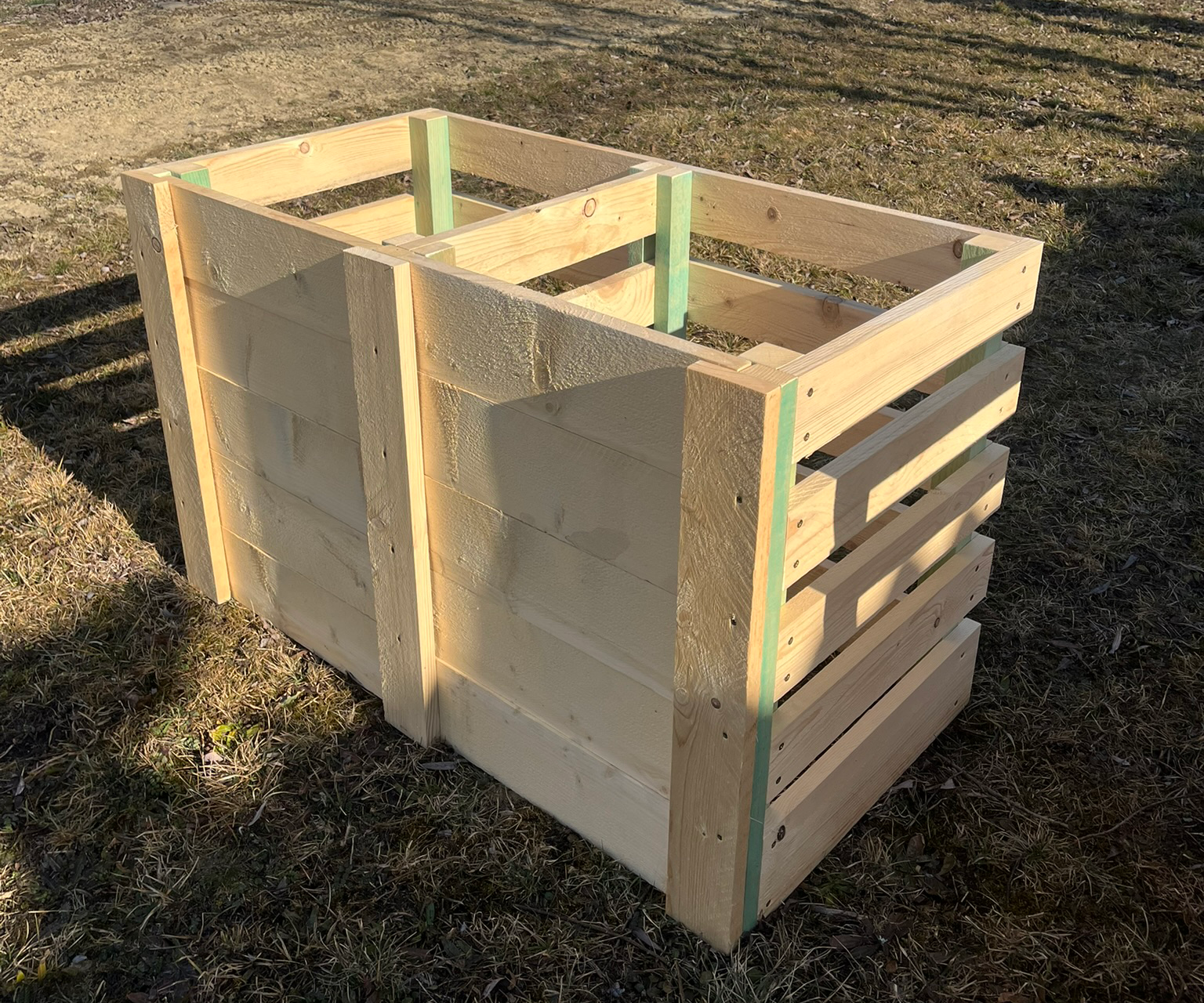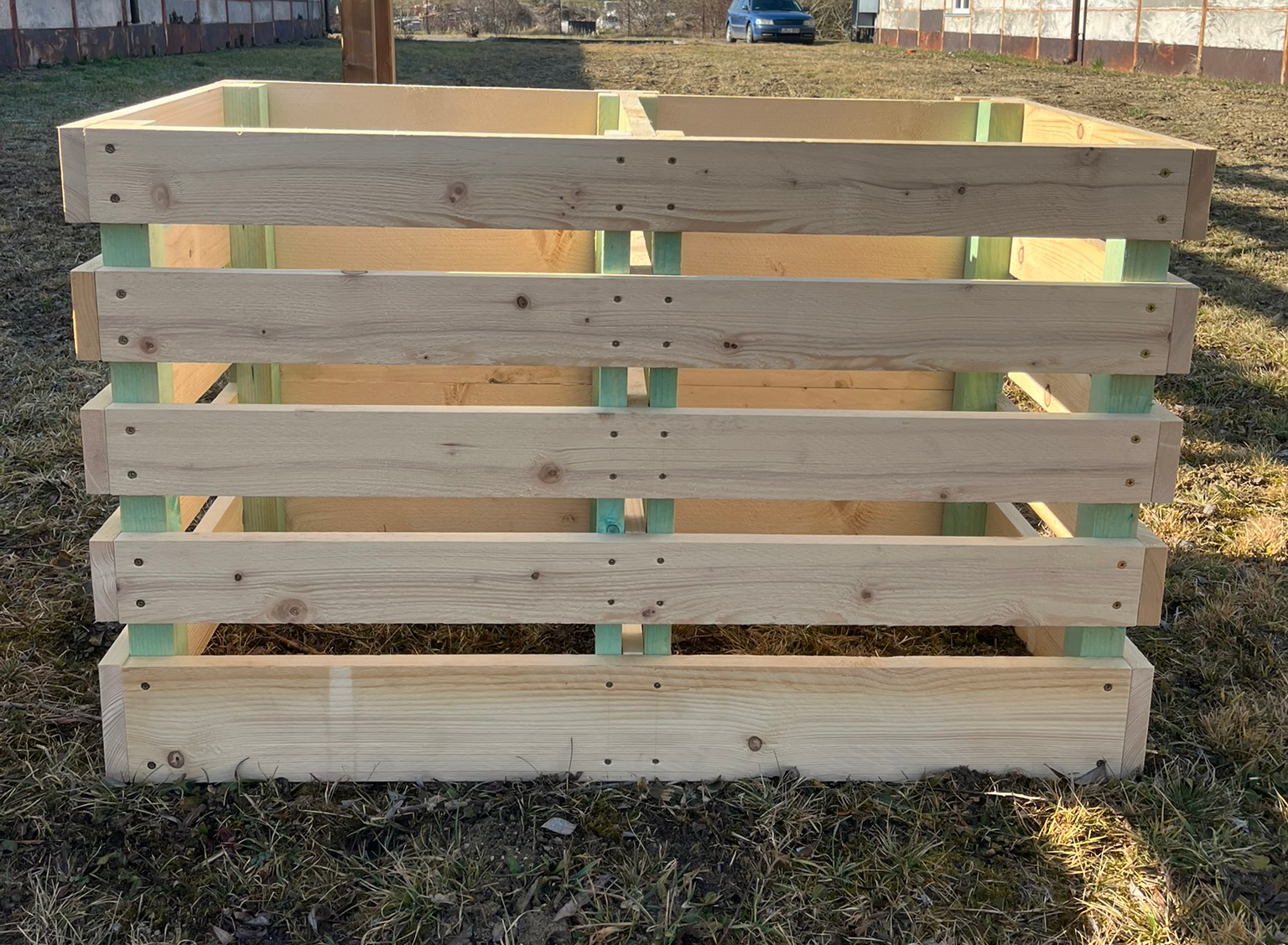 A komposzt oldala nyitott, a lécek kivehetőek.