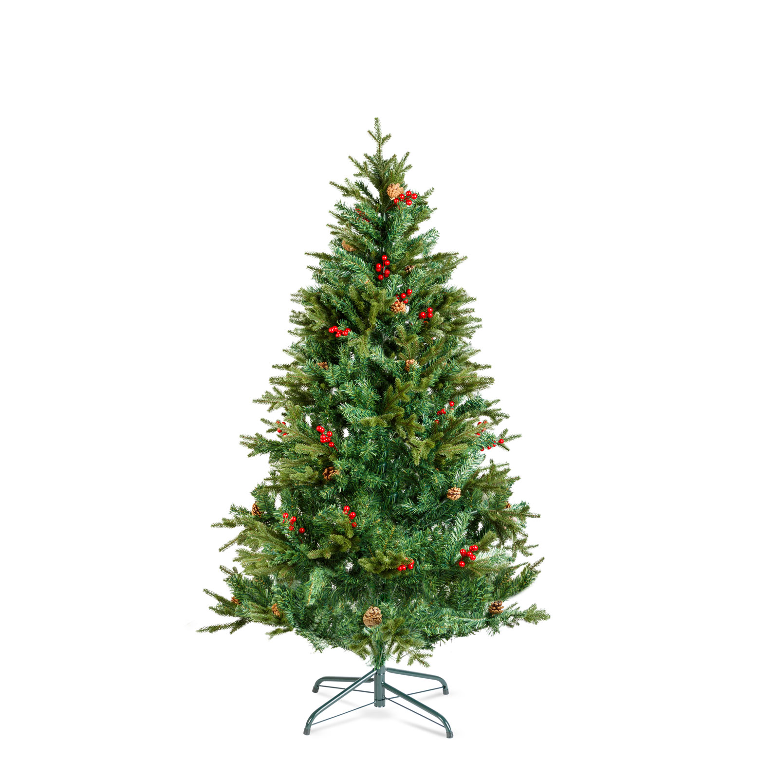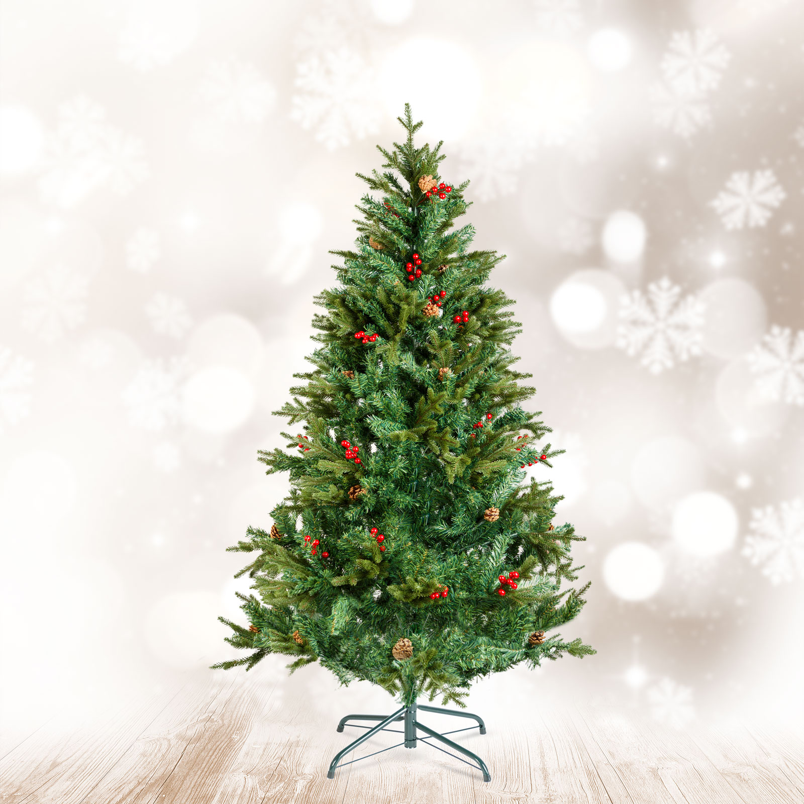 Varázsoljon meghitt ünnepi hangulatot otthonába, ezzel a klasszikus zöld műfenyővel! A sűrű ágrendszer és a dús, élethű tűlevelek és a piros bogyók természetes hatást keltenek, így tökéletes alternatívát nyújtanak az élő fenyő helyett. A tartós anyagból készült műfenyő hosszú éveken át megőrzi szépségét, miközben nem hullatja tűleveleit.