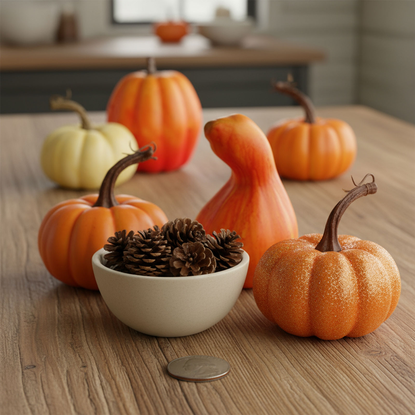 Teremtsen meghitt őszi hangulatot otthonában ezekkel a dekoratív tökökkel! Hatféle különböző formájú és színű műanyag tök, kukorica, amelyek élethű megjelenésükkel tökéletes kiegészítői lehetnek bármely őszi dekorációnak. Használhatja őket asztali díszként, koszorúk részeként vagy kreatív dekorációs ötletek megvalósításához. Könnyű, tartós kialakításuknak köszönhetően hosszú távon is megőrzik szépségüket.