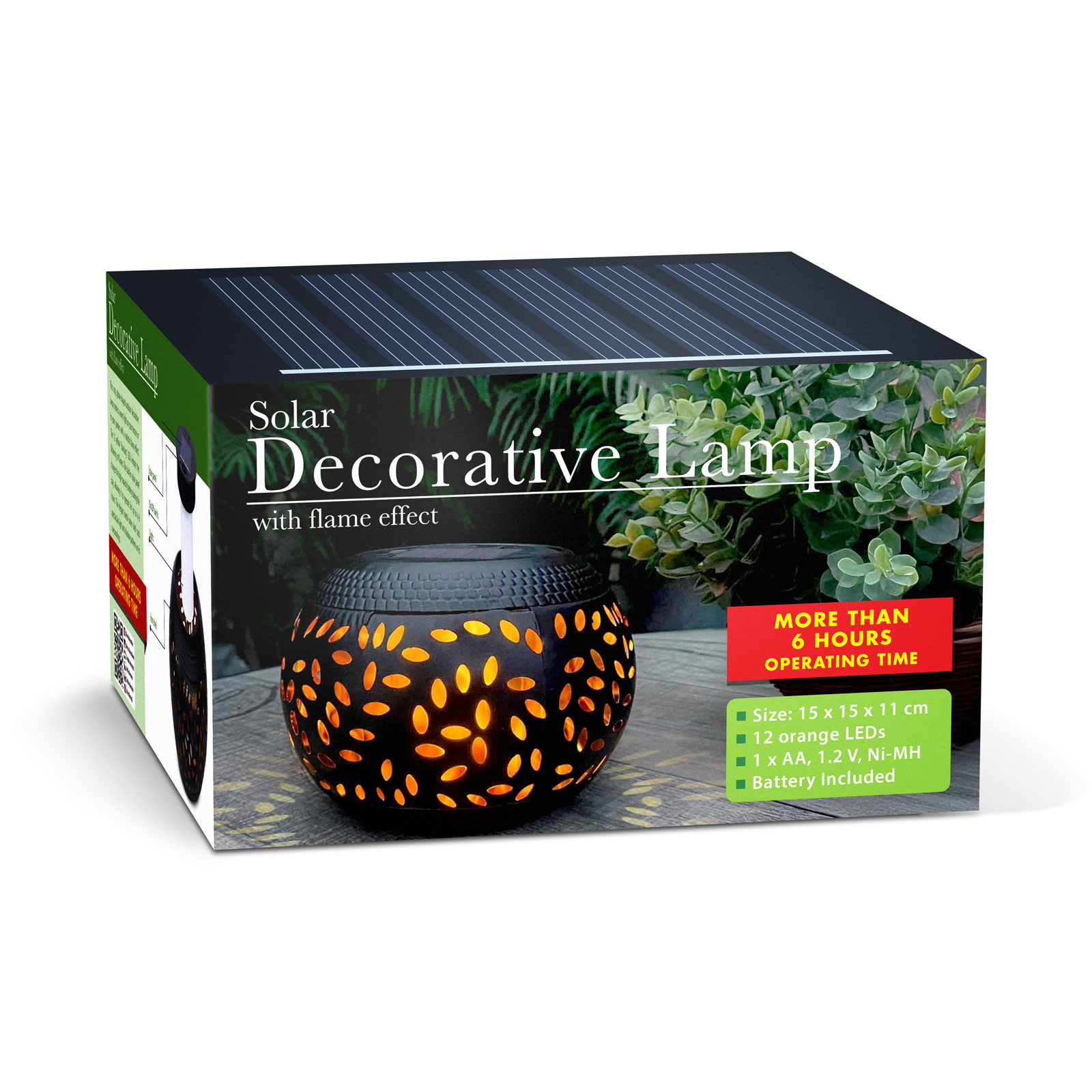 Ez a hangulatos, gömb formájú kültéri dekor lámpa valósághű láng effektussal teremt meleg fényt teraszán vagy kertjében. A 12 darab sárga “táncoló” LED izzó imitálja a láng lobogását. A beépített 45 × 45 mm-es napelem napközben feltölti a nagykapacitású akkumulátort, így akár 6-8 órán keresztül is képes működni. Az elegáns fém külső héj látványos fény-árnyék mintázatot vet a környezetére.