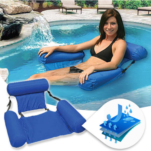 Akár egyenesen, akár teljesen hátradőlve ülsz ebben az úszófotelben félig víz alá merülve hűtheted magad a strandon.